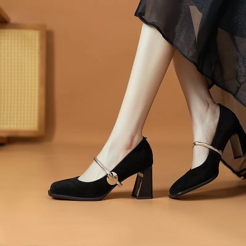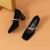New Retro Square Toe High Heels With Metal Strap; Shallow Mouth Velvet Thick Heel Versatile Single Shoes For Skirts Heels Women