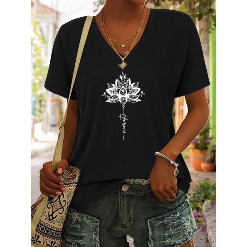 Texture printed women's V-neck short sleeved T-shirt, soft fabric women's short sleeved top