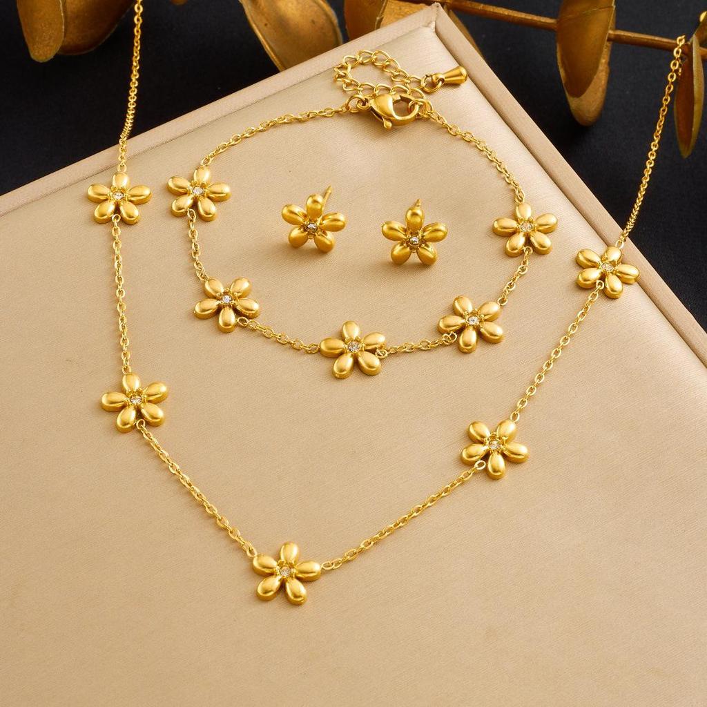 Trendy Gold-Plated Flower Pendant Necklace Set with Diamond Inlay