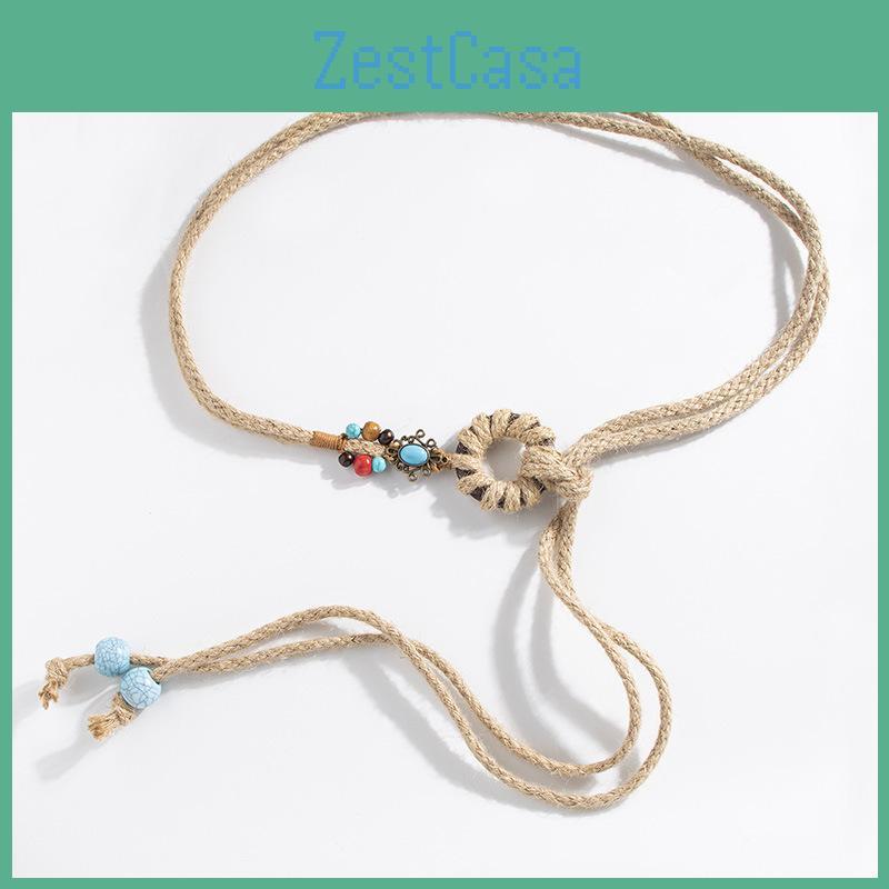 This bohemian-style waist cord features hand-woven macrame and natural turquoise stones, delivering a unique ethnic aesthetic. Made from breathable cotton and linen, it measures between 115cm and 130cm with, suitable for casual or resort wear. Ideal for relaxed summer outings, it supports adjustable tying for a secure fit. Wipe clean with a damp cloth to maintain its handcrafted appearance.