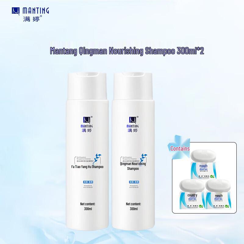 This MANTING Cleansing & Nourishing Shampoo set is specially formulated for women with oily scalps. It targets dandruff, controls oil, and provides repair, while also featuring mite removal properties. The set includes two 300ml bottles of shampoo and three anti-mite soaps for comprehensive scalp care.