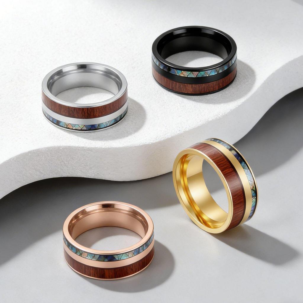 European-American Wood Grain Abalone Shell Titanium Steel Ring - Luxury Men's Tungsten Carbide Jewelry.
