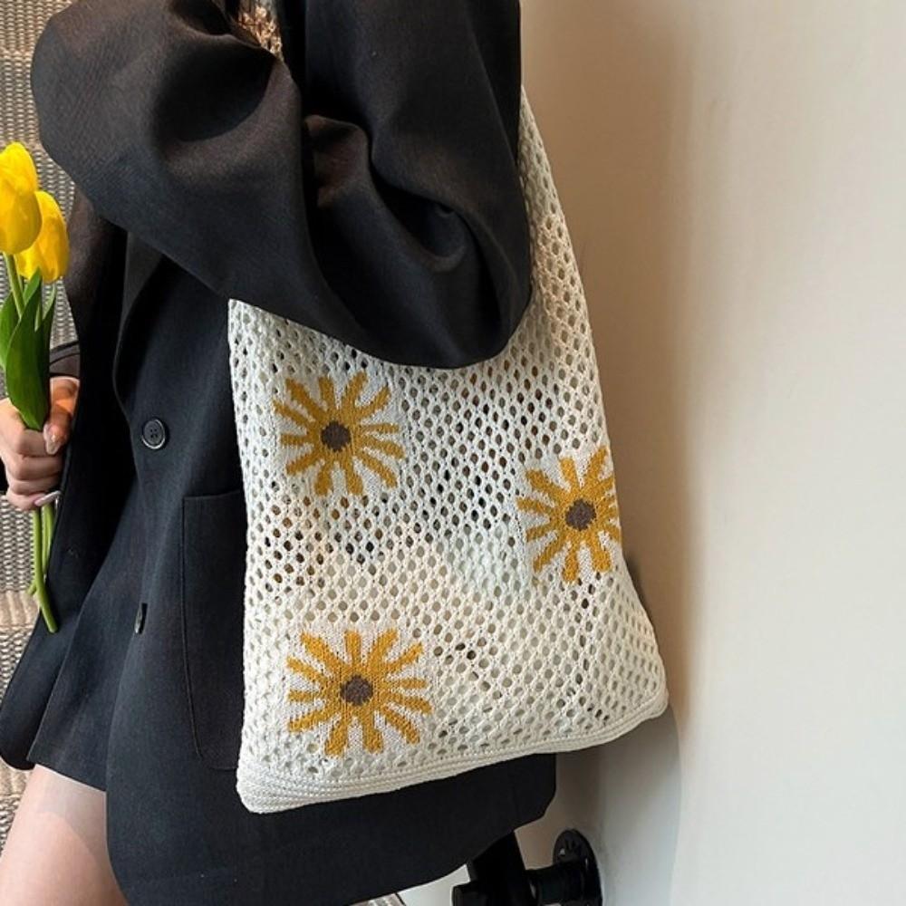 Large Capacity Beach Knitting Bag Flowers Pattern Hollow Shoulder Bag Crochet Tote Bag Office