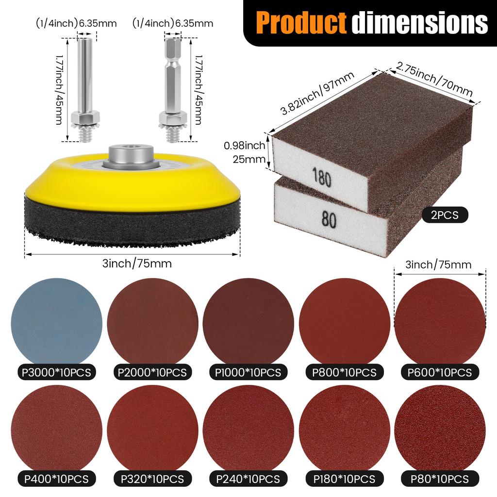 100Pcs 3inch75mm Sanding Discs Pad with 2Pcs Sanding Sponge Buffing Blocks 80-3000 Grit for Drill Grinder Rotary Tools Attachmen