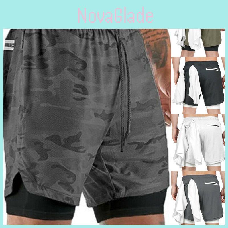 Men's Camo Running Double-deck Stretchy Quick Dry Gym Shorts With Secure Phone Bag