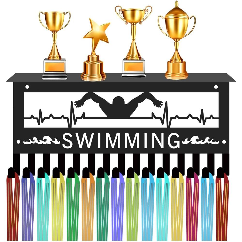 Swimming Medal Hanger Display with Shelf, Trophy Medal Holder Rack Iron Wall Mount Decor Metal Organizer for Hanging Medals Swimmer 11.8 x 5.1 Inch