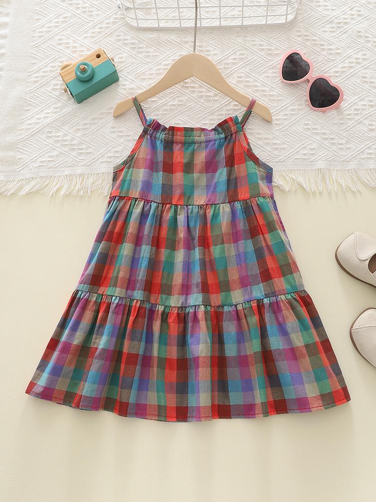 Korean-Style Girls' Summer Plaid Strappy Dress - Colorful and Stylish