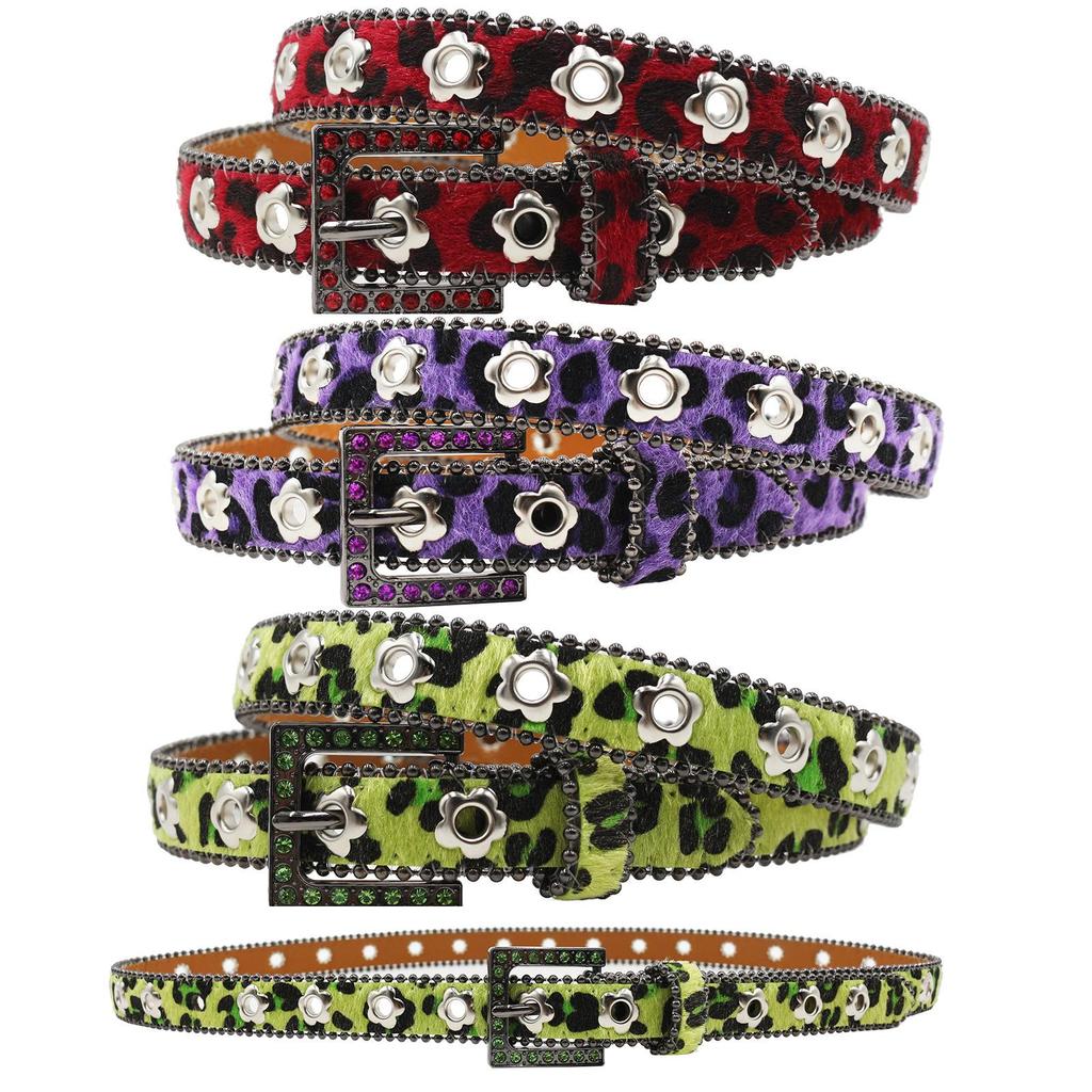 Luxury 2.3cm Leopard Print Leather Belt with Floral Eyelets & Rhinestones, No Punching Needed, Pin Buckle, Fully Diamond-Encrusted.