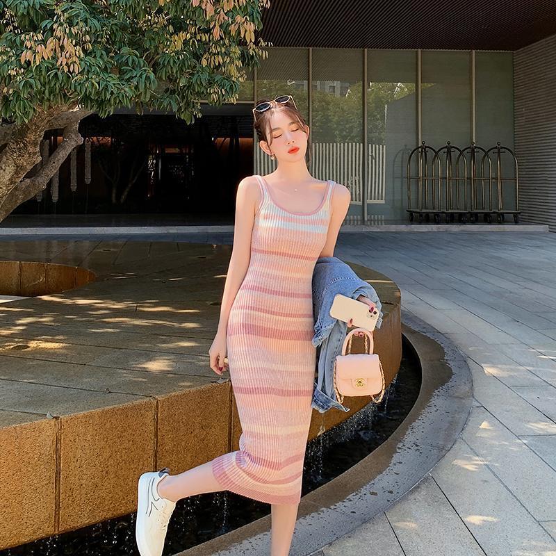 Women's Rainbow Stripe Sleeveless Knit Camisole Dress - Slim Fit Summer Mid-Length