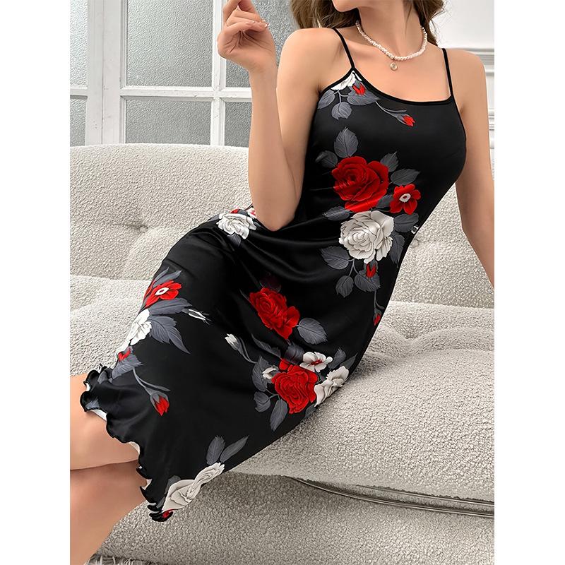 2025 Rose Print Women's Elegant Midi Sling Nightgown