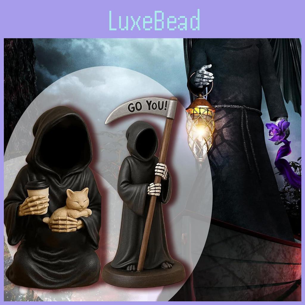 This Halloween-themed Grim Reaper figurine features detailed resin craftsmanship,It showcases a stylized design with dual color options: a black cat or a scythe-wielding death figure, perfect for festive decorations. Suitable for party decor and holiday celebrations, it adds a spooky touch to any setting. Easy to clean with a damp cloth, this figure enhances seasonal ambiance during Halloween festivities.
