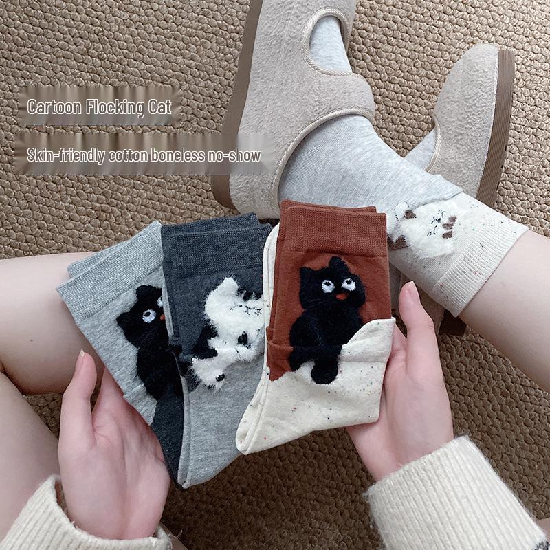 Cartoon Kitten Mid-Calf Socks: Cute Korean-Style Fuzzy Warm Women's Socks for Autumn and Winter