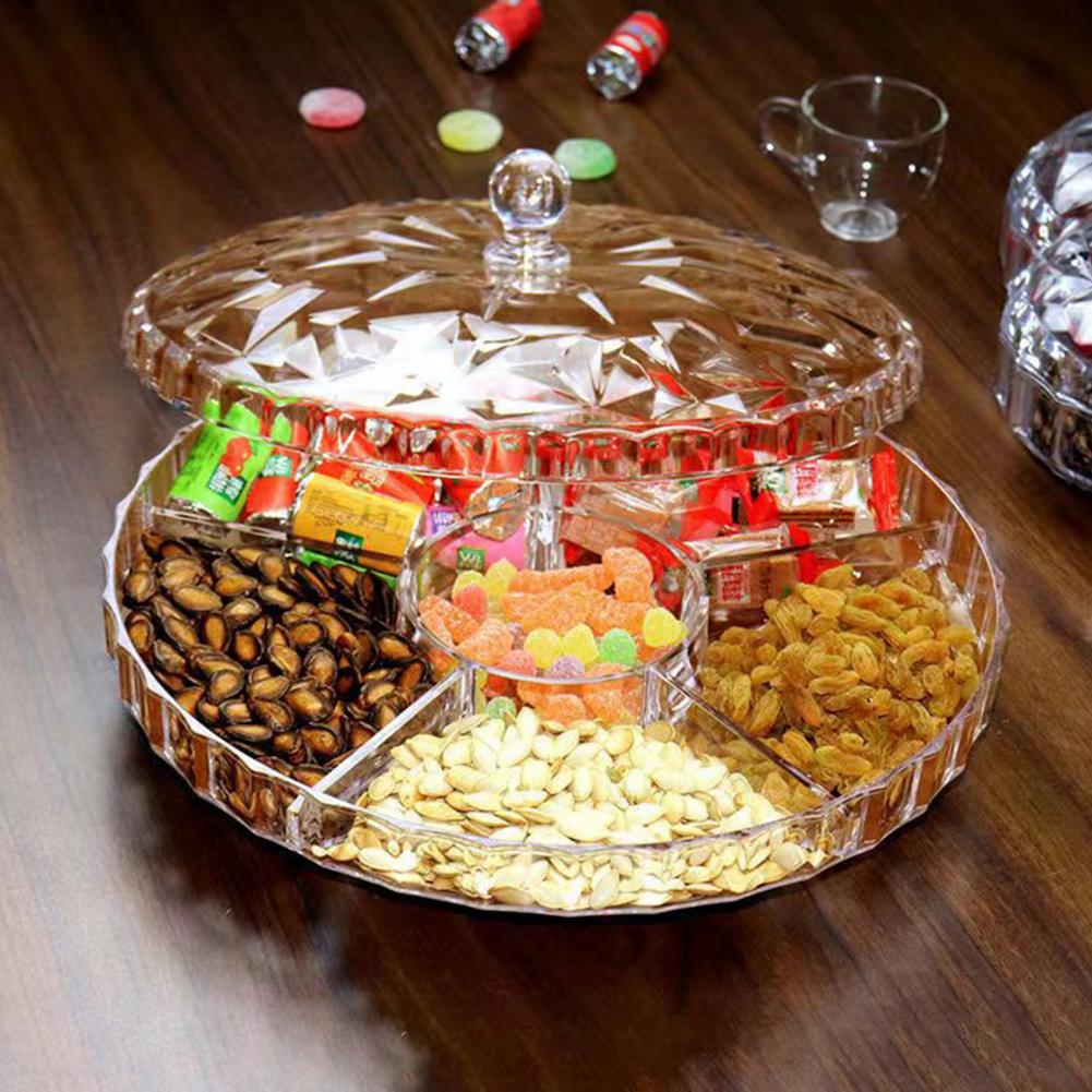 Dustproof Snack Container Round Plastic Food Storage Bin Dustproof Round Snack Serving Tray with Lid 6 Compartment for Dried