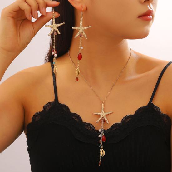This elegant jewelry set features a smart tassel pendant design, with long tassel earrings and necklaces that sway gracefully, visually elongating the neckline for a sophisticated, exotic look. Inspired by rich resort style, it incorporates starfish and shell motifs combined with red agate, colorful beads, and pearl pendants, perfectly capturing the romantic Bohemian seaside vibe ideal for beach outings and parties. Versatile for multiple occasions, it complements beachwear like skirts and bikinis as well as casual and work outfits, enhancing any ensemble effortlessly.