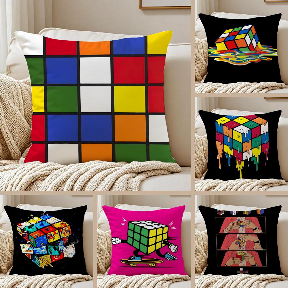 Creative Magic Cube Puzzle Design Art Cushion Cover Pillowcase Antidustmite Invisible Zipper Short Plush Sofa Cushion