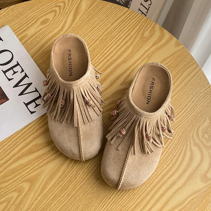 New Women's Flat Shoes Cover Toe Increased Internal Fringe String Bead Slippers Fashion All-match Spring and Autumn Single Shoes