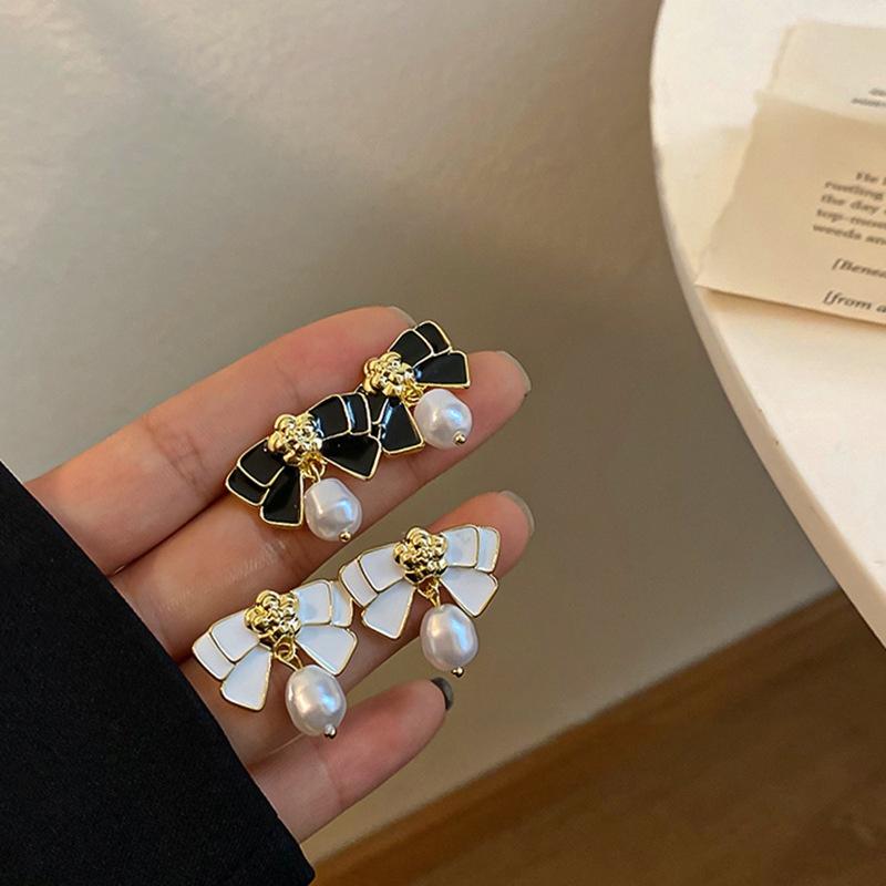 Trendy Black White Enamel Oil Bow Knot Drop Earrings For Women Elegant Imiation Pearl Dangle Earrings Wedding Party Jewelry Gift