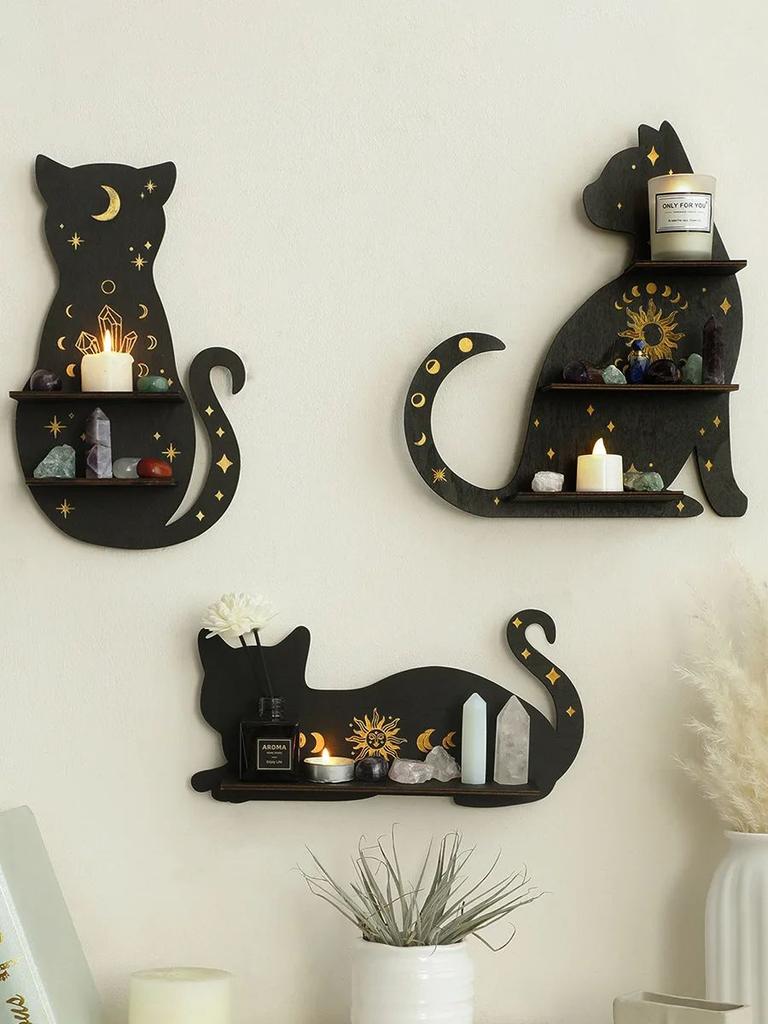 Wooden Shelf 1/2-Tier Moon Phase Black Cat Wall Shelves Crystal Display Stand Essential Oil Rack Ledge Gothic Home Decor Gifts
