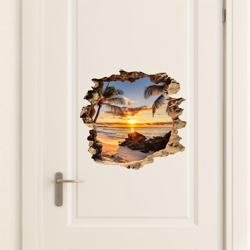3D Break Through The Wall Beach Ocean Landscape Wall Decal Lifelike Wall Sticker PVC Irregular Shape Mural Background Wall Decor