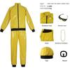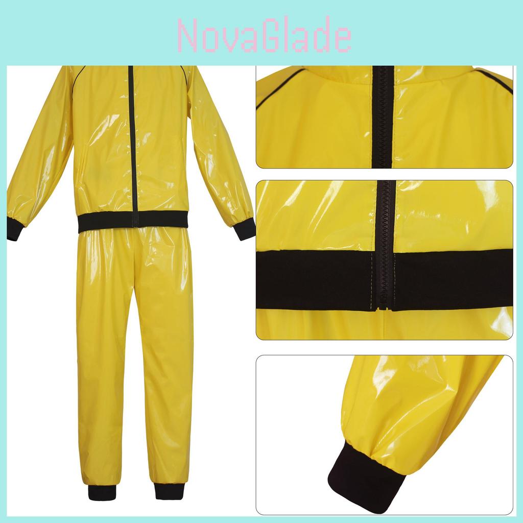 This costume features a vibrant yellow disco-style patent leather material, measuring approximately 20 inches wide and 25 inches long, crafted from durable polyester fiber. It includes detailed accessories, perfect for cosplay or themed events. Designed for sizes XS to XXXL, it supports easy movement and comfort during performances. Wipe clean with a damp cloth to maintain its glossy finish. Ideal for anime, gaming, or fantasy-themed cosplay occasions.