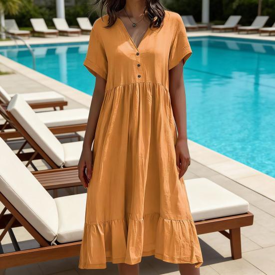 This women's dress features charming button decorations on the chest, adding both style and depth to its simple design. Available in fresh and natural colors like lime green, warm orange, lake green, and subtle gray, it suits various occasions and personal styles. The classic V-neck enhances the neckline and face shape, offering a feminine yet comfortable fit.