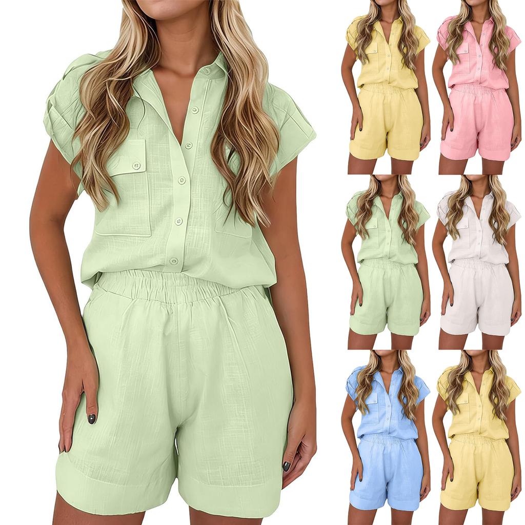 Womens Cotton Linen Two Piece Outfits Spring Summer Shorts Set Cap Sleeve Button Down Tops And Shorts Sets