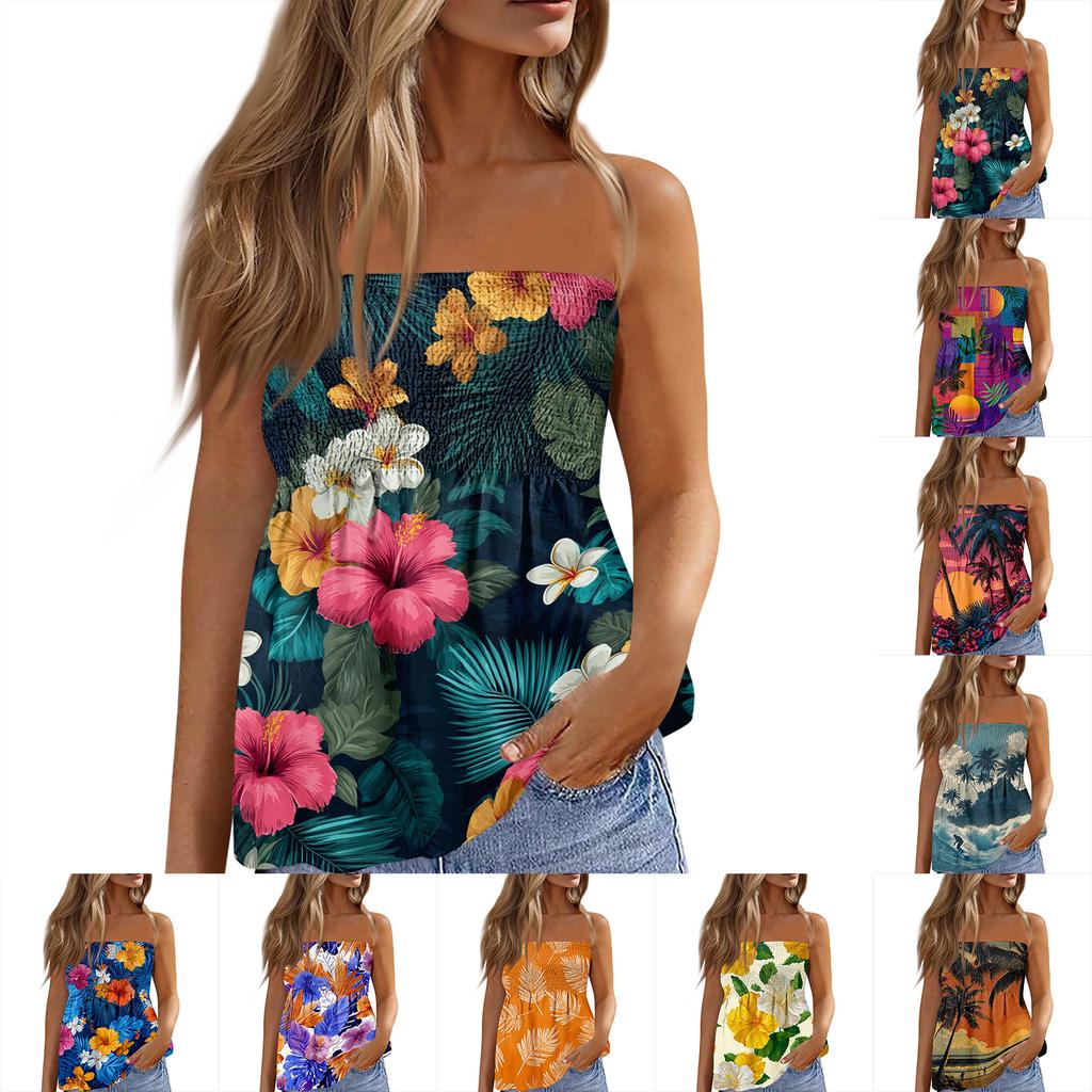 Women's Summer Fashion Strapless Top, Cute and Sexy Off-Shoulder Hawaiian Print Sleeveless T-Shirt