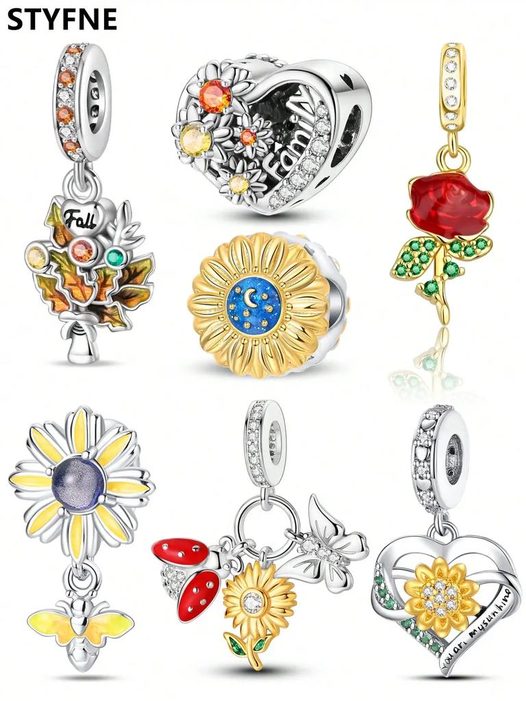 Charm Plata Copper Colors Rose Sunflower Bead Charms Pendants For Genuine Bracelets For Women DoItYourself Jewellery Love Gifts