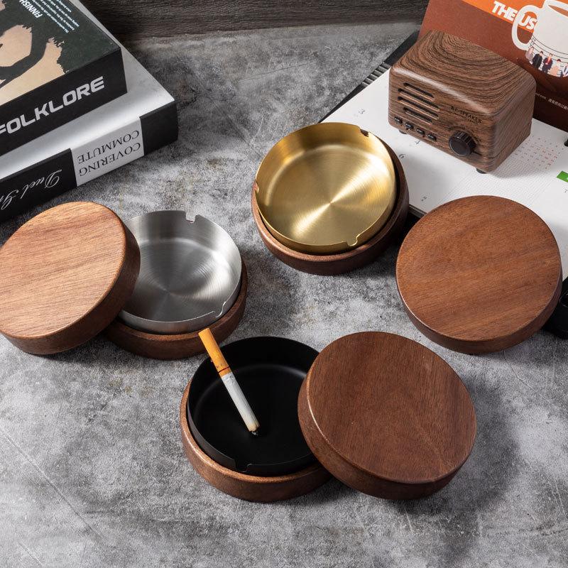 Gold-Stainless Steel Ashtray with Lid, Solid Wood Base – Anti-Ash Design for Home and Office, Ideal Gift.