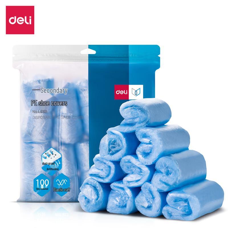 Deli LS101 disposable PE shoe covers are designed for various applications, including dust protection and cleanroom environments. Made from durable, wear-resistant PE material, these light blue shoe covers come in a convenient 100-piece pack, ensuring hygiene and cleanliness. Each pack is sealed in an OPP bag for easy storage.