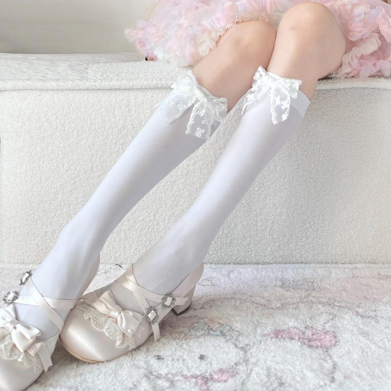 White lace floral bow calf socks Lolita Velvet mid-calf socks with trendy patterns, pure and desirable