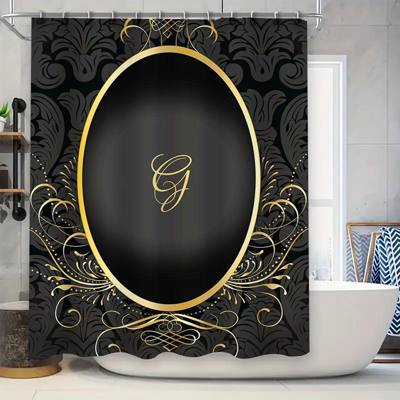 Luxurious Black Gold Bathroom Shower Curtain Decorative Oval Initial Monogram Design for Personalized Home Decor Modern Interior