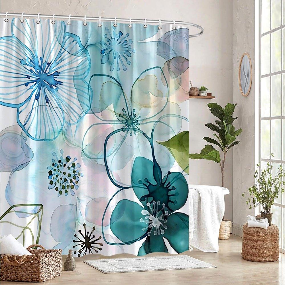 1pc Abstract Floral Shower Curtain - Blue, Teal, Green Flowers, Modern Design, Polyester, 70x70In, 12 Hooks, Washable