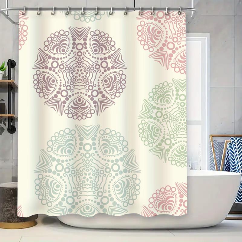 Beautiful Mandala Pattern Shower Curtain Set for Bathroom Decor Pink, Green Beige Colors Included with Hooks 72x84 inches Size