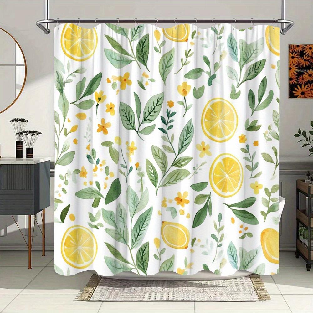 Lemon & Leaf Curtain - Watercolor, 70In, Water-Resistant Polyester, 12 Hooks, White Background, Botanical Design