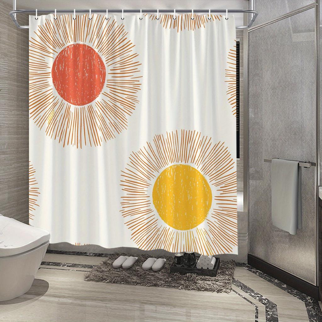 Mid-Century Modern Sunburst Shower Curtain – Cream with Orange & Yellow Radiant Lines, Polyester for Stylish Bathroom Decor