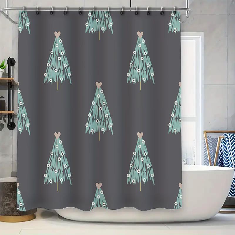 Blue Christmas Tree Shower Curtain with Heart Shaped Top Design for Bathroom Decor Waterproof Fabric Decoration (86x174cm)
