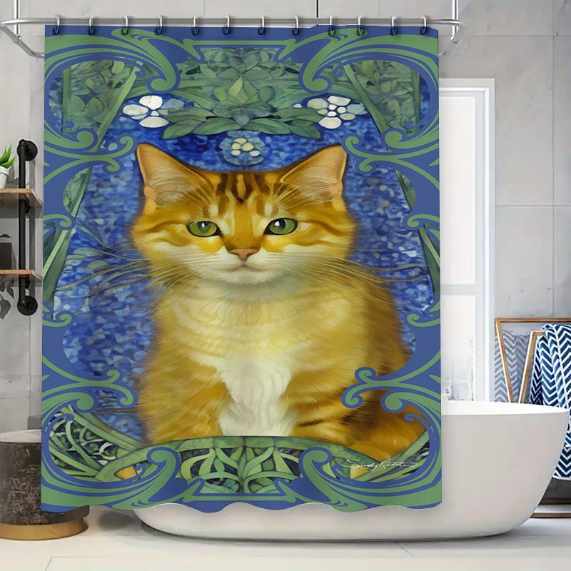 Luxury Print Shower Curtain Blue Floral Design with Cat Portrait for Bathroom Decor Modern Home Decoration Waterproof Fabric Sha