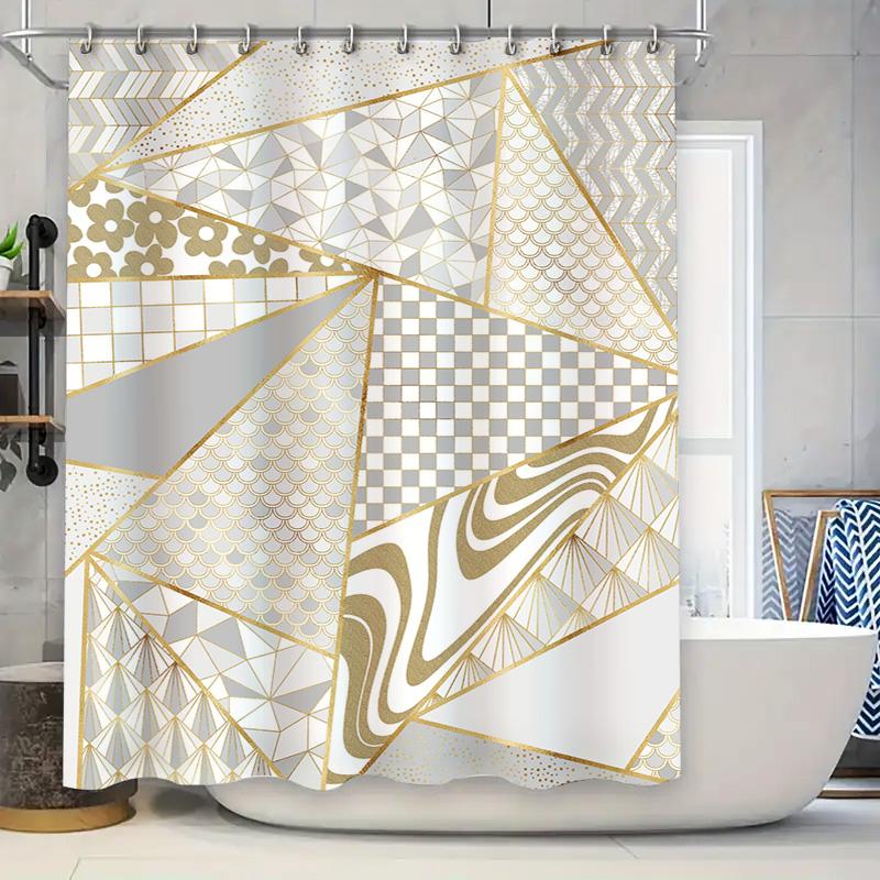 White Gold Geometric Shower Curtain, Luxury Bathroom Decor, Modern Bathtub Cover Waterproof Fabric for Wet Areas, 72 x 84 Inches