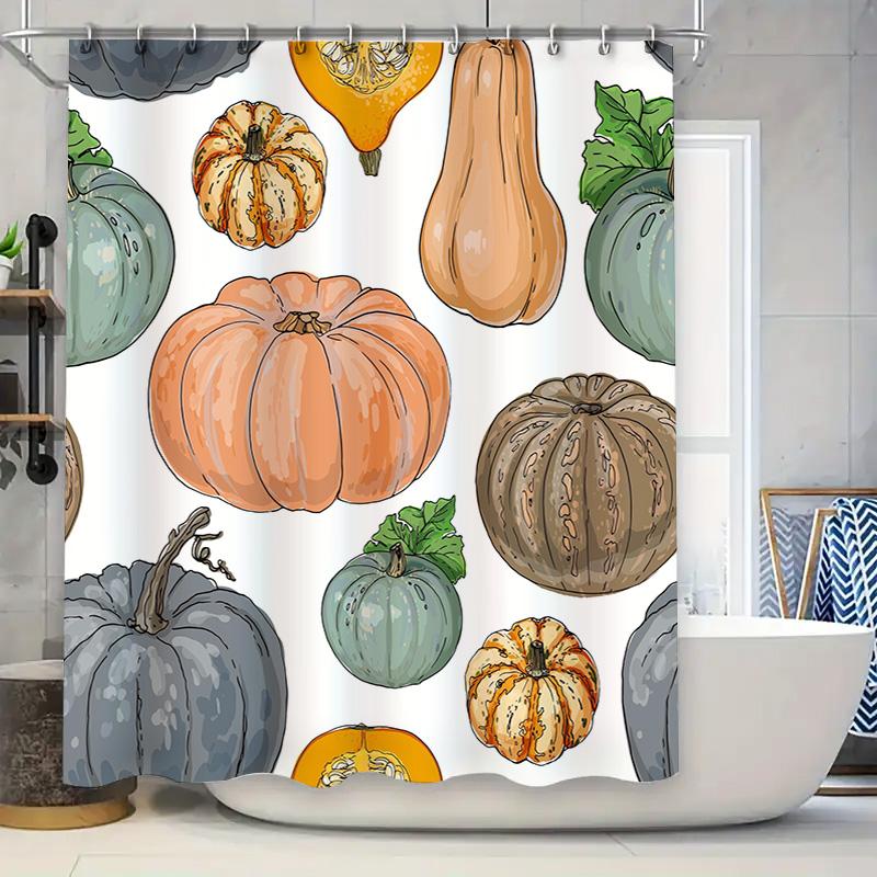 Hand-drawn pumpkin shower curtain colorful autumn leaves design for bathroom decor waterproof fabric made from polyester (blue)