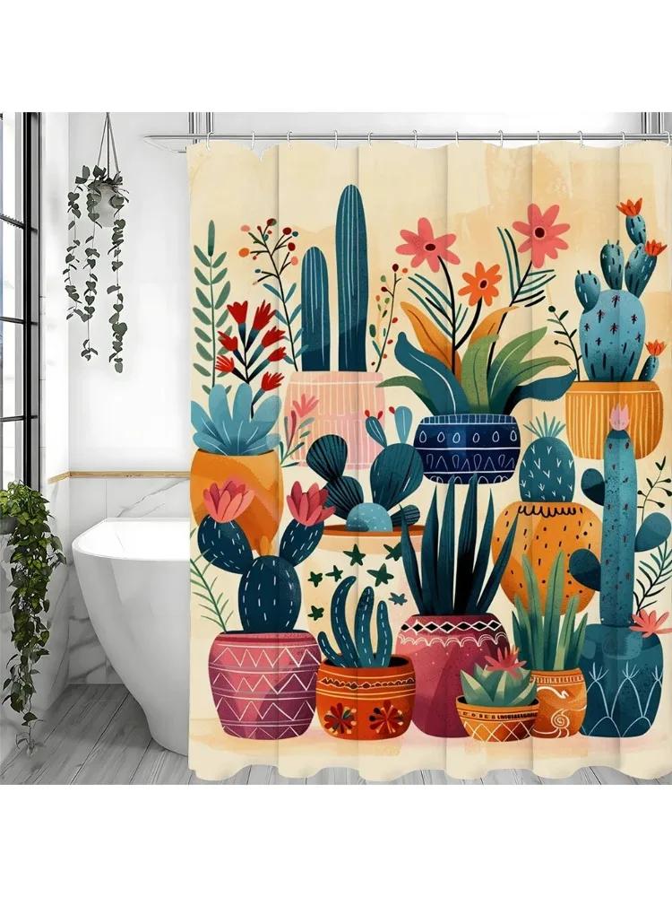 ~O~Green Potted Cactus Flower Shower Curtain, Bathroom Decorative Shower Curtain, Waterproof Shower Curtain with Hooks