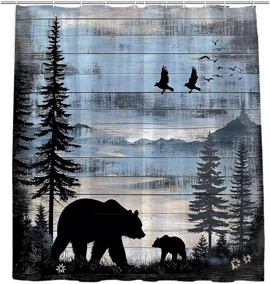 Rustic Forest Bear Shower Curtain Cabin Farmhouse Animal Country Lodge Retro Wooden Board Tree Wildlife Blue Vintage Hunting