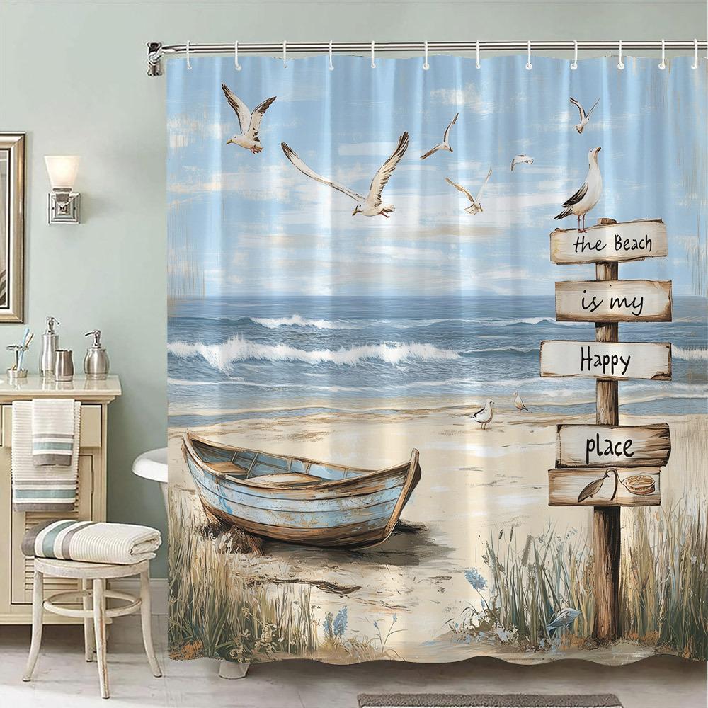 Seaside Beach with Boats and Driftwood Shower Curtain for Bathroom Decor, Perfect for Adding Coastal Charm