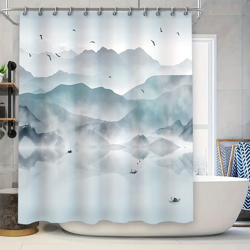 Misty Mountains Lake Serenity Shower Curtain Nature Inspired Home Decor Waterproof Polyester Chinese Ancient Style Design