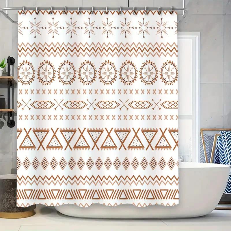 Rustic Geometric Shower Curtain Bath Decor Set with 12 Hooks in Neutral Beige Tones for Modern Home Bathroom
