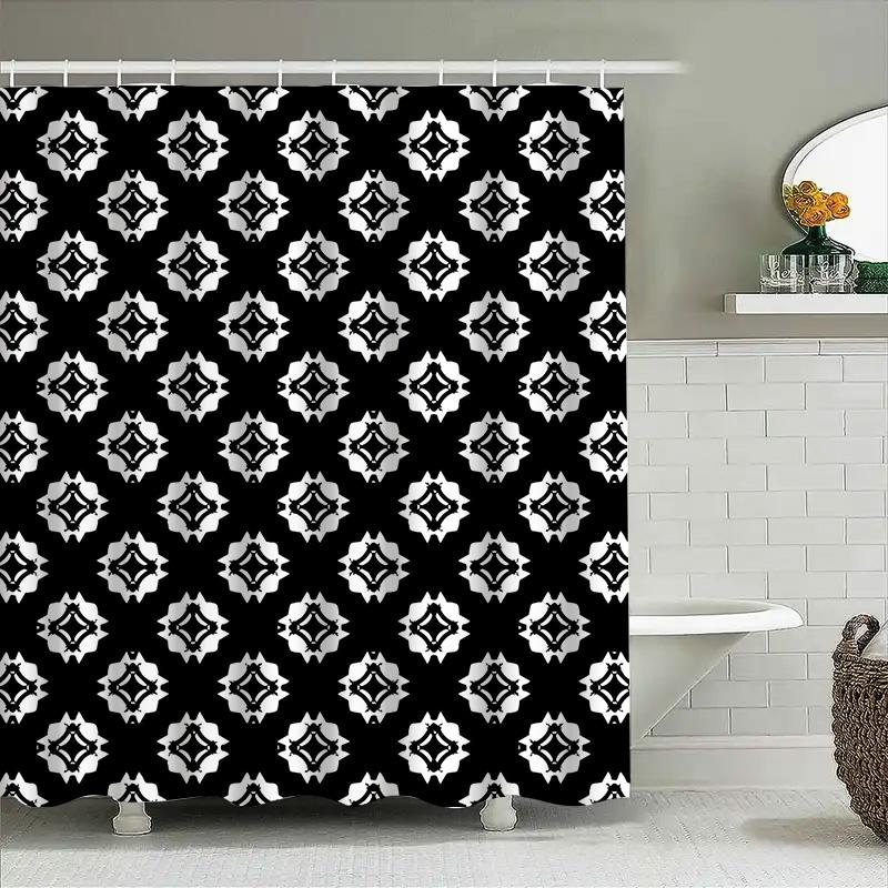 White Black Geometric Shower Curtain with Metal Hook Rings Decorative Bath Liner for Home Use