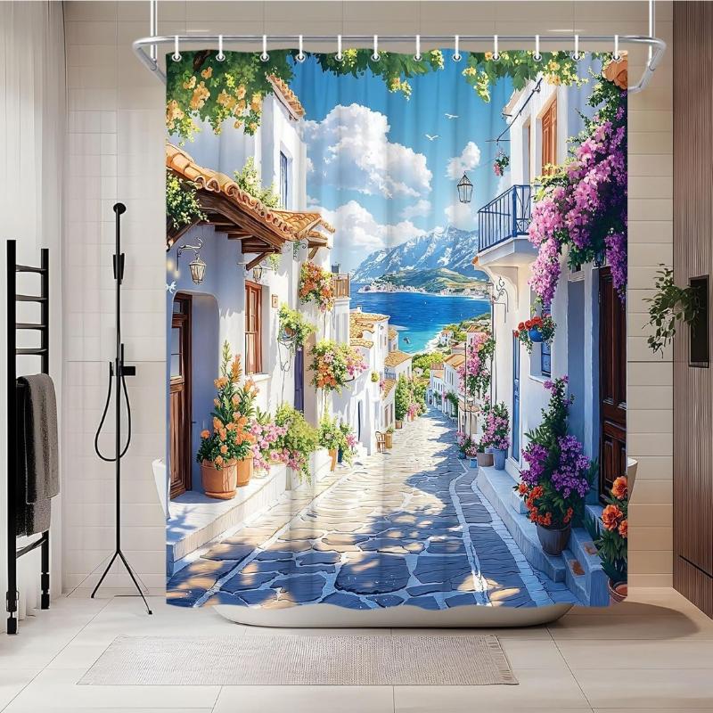 Coastal Shower Curtain Greece Natural Landscape Mediterranean White Architecture Italian Rustic European City Town Street Shower