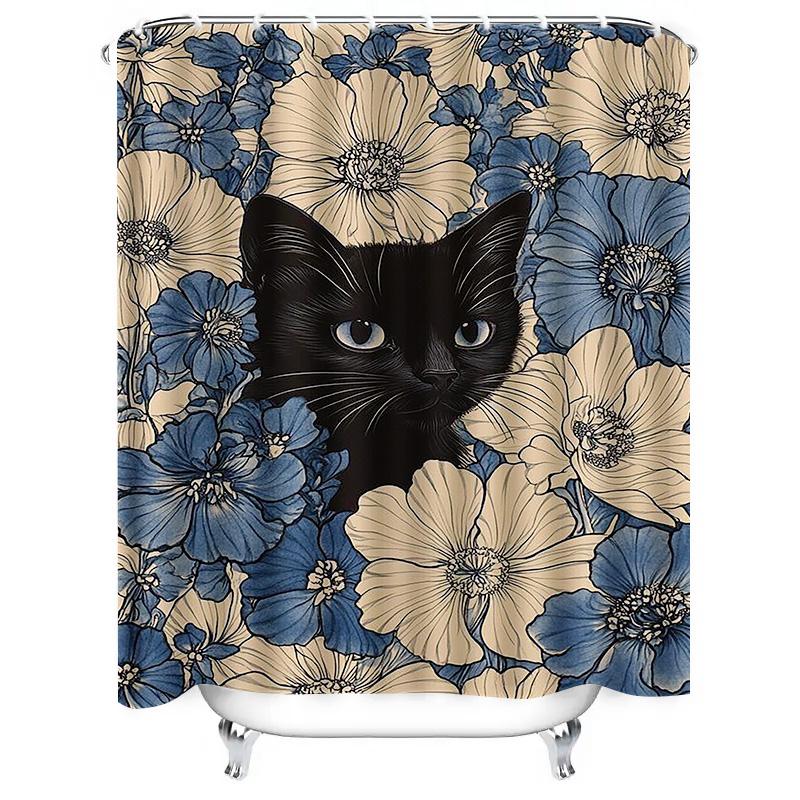 Black Cat in Floral Pattern Waterproof Shower Curtain Heat Resistant Machine Washable Non-Transparent 180x180cm