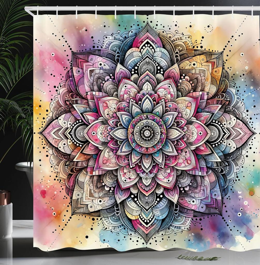 Colorful Shower Curtain, Oriental Boho Flourishing Mandala Flower and Aquarelle Look Hues Print, Cloth Fabric Bathroom Decor Set