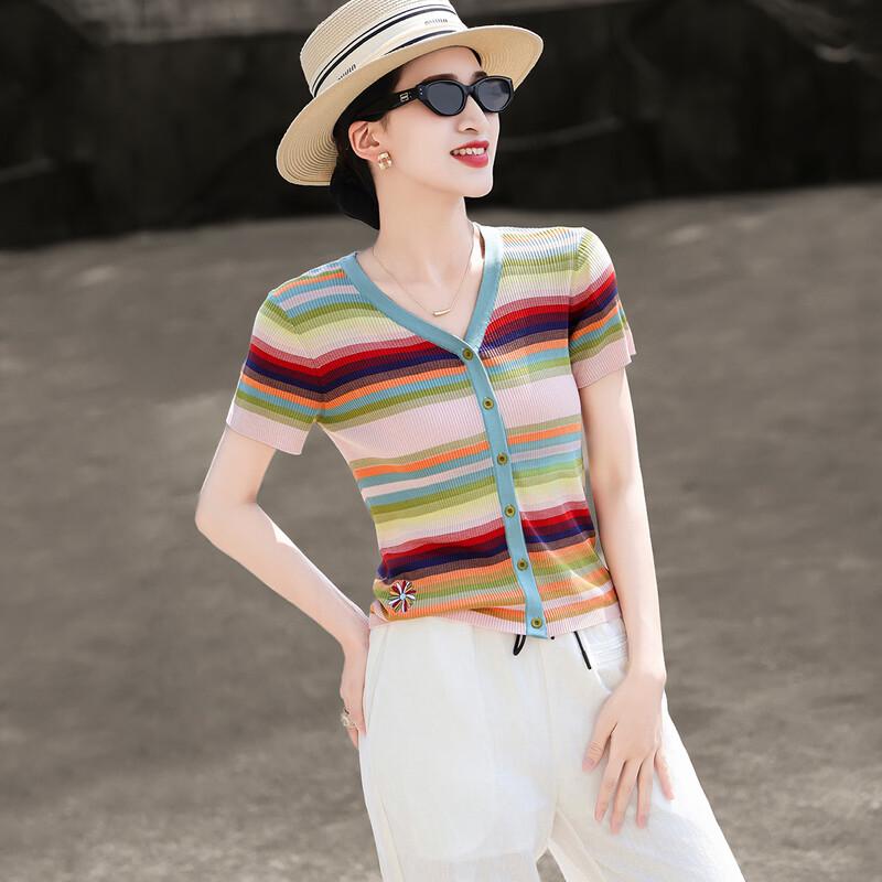 Lansere Women's Striped V-Neck Knit Short-Sleeve Top